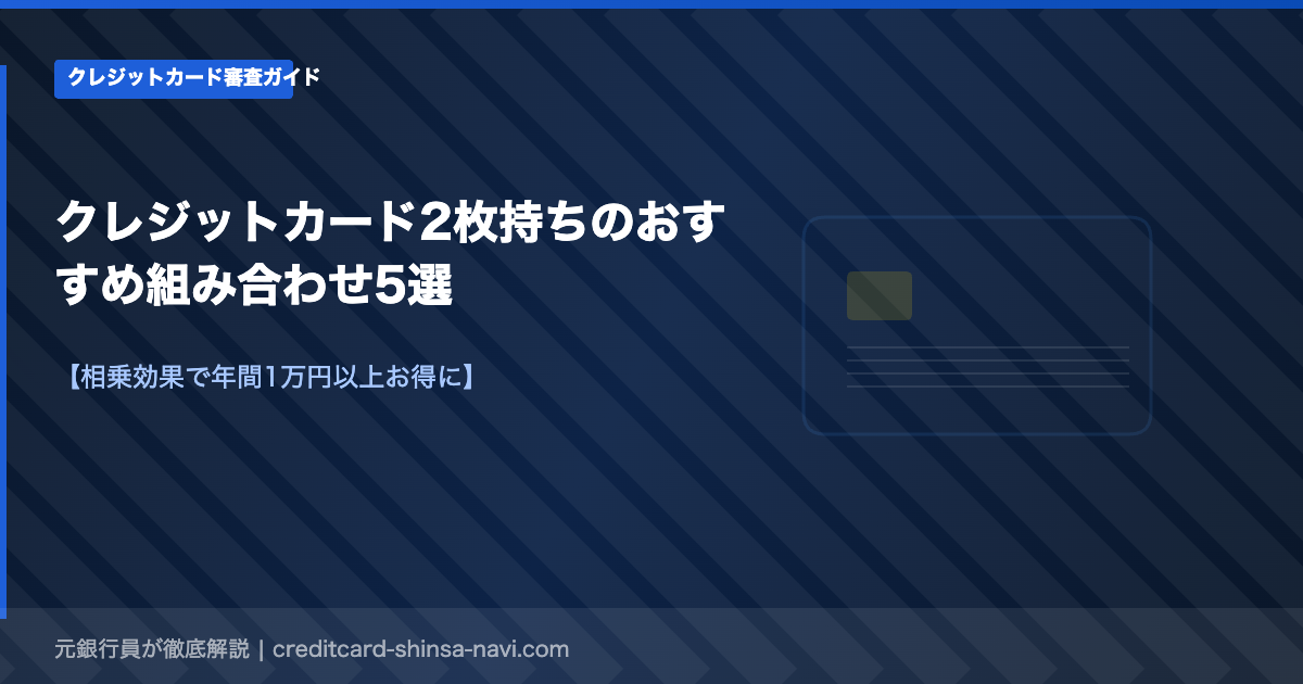クレジットカードは1枚より2枚持つことで、ポイント還元率の最大化・特典の組み合わせ・リスク分散など多くのメリットが生まれます。この記事では、相乗効果で年間1万円以上お得になるおすすめ2枚持ち組み合わせ5選を紹介します。