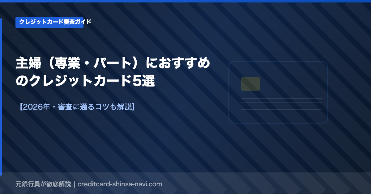 主婦がクレジットカードを選ぶ際は「審査に通るか」「家計管理に役立つか」「ポイントの使い勝手が良いか」の3点が重要です。専業主婦でも配偶者収入を申告することでカードを作れます。この記事では専業主婦・パート主婦それぞれにおすすめのカード5枚を2026年最新情報で紹介します。