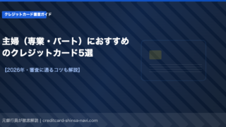 クレジットカード審査主婦(専業・パート)におすすめのクレジットカード5選【2026年・審査に通るコツも解説】 専業主婦・パート主婦でも審査に通りやすいクレジットカード5選を紹介。収入なしでも申し込める条件や、主婦が得するポイント・特典も詳しく解説。 2026.03.12クレジットカード審査