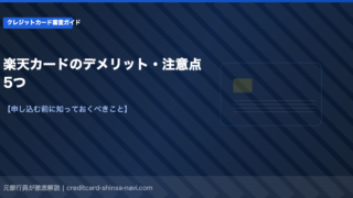 クレジットカード審査楽天カードのデメリット・注意点5つ【申し込む前に知っておくべきこと】 楽天カードのデメリットと注意点を正直に解説。ポイントが貯まらないケース・キャッシング利息・楽天経済圏依存の問題など、申し込む前に確認しておきたい点を網羅。 2026.03.12クレジットカード審査